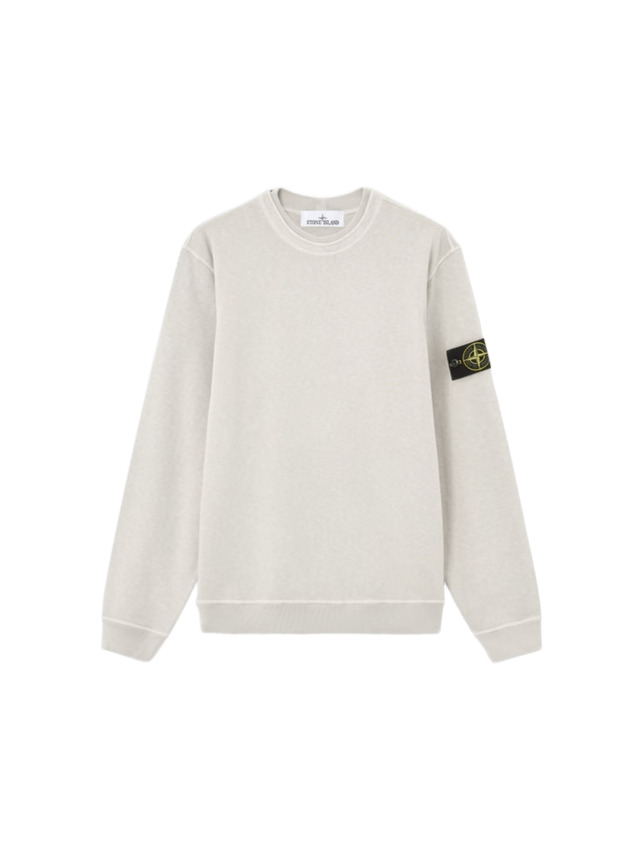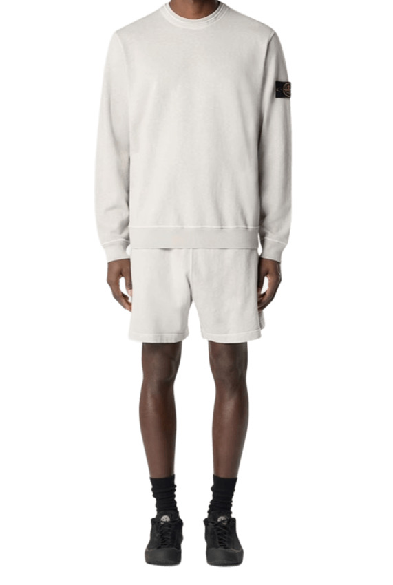 Felpa girocollo in cotone malfilé con cuciture overlock e bordi a costine. Modello tinto in capo con effetto OLD, per un aspetto leggermente vissuto con inserto a costine sullo scollo interno, cuciture overlock sul bordo esterno dello scollo, badge Stone Island sulla manica sinistra. Polsini e fascia inferiore a costine, pesantezza leggera.