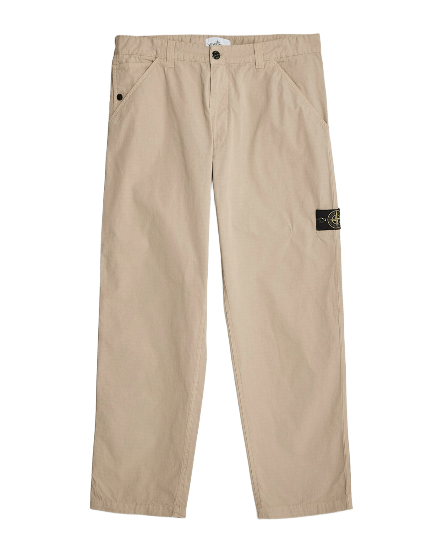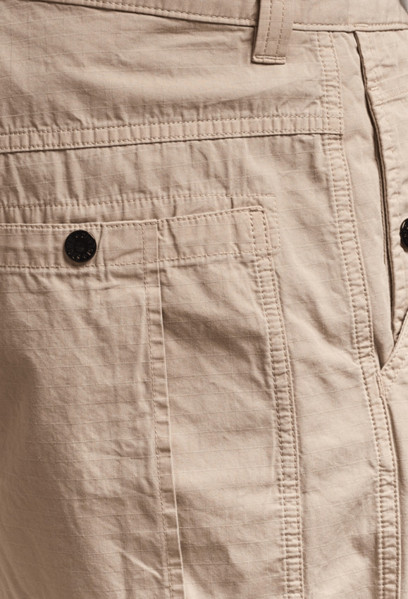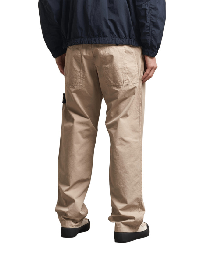 Presenta tasche anteriori oblique, tasche verticali con bottone automatico sul lato destro, tasche posteriori applicate con bottone automatico e dettaglio piega. Apertura superiore aggiuntiva . Badge Stone Island sulla gamba sinistra. Chiusura con bottone e patella con zip.
