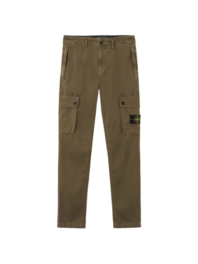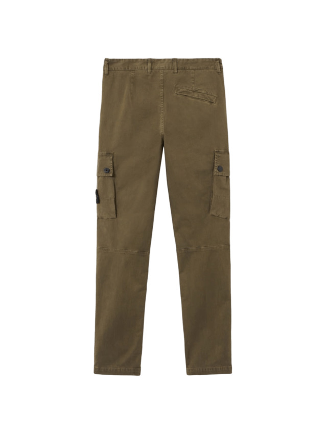 Tasche verticali con zip nascosta. Tasca posteriore obliqua con automatico nascosto sotto patta fissa. Tasca a soffietto con patta sulle gambe con due automatici; badge Stone Island sulla tasca della gamba sinistra. Patella con zip e bottone.