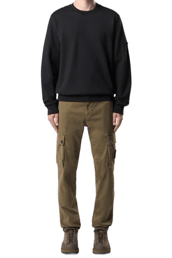 Pantalone cargo in twill di cotone broken biologico stretch, con tasche con zip e tasche supplementari con automatico. Modello tinto in capo con effetto OLD, per un look leggermente vissuto.