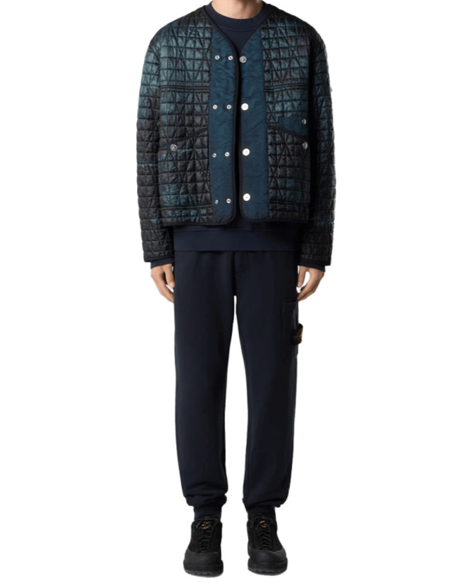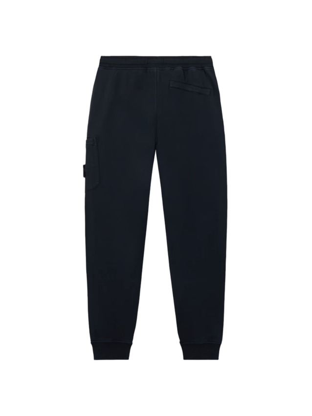Pantalone jogger in felpa di cotone biologico, con tasche verticali. Tasca posteriore con automatico sotto fascia fissa. Tasca applicata sulla gamba sinistra con zip nascosta e badge Stone Island. fondo gamba elasticizzato e coulisse elastica in vita. Patella con zip. Modello tinto in capo.