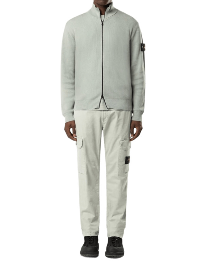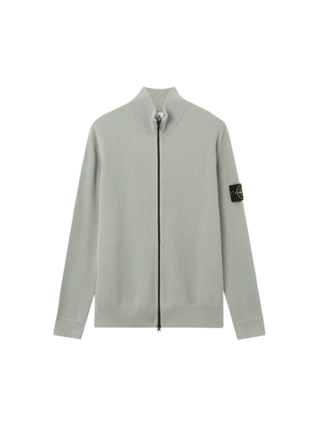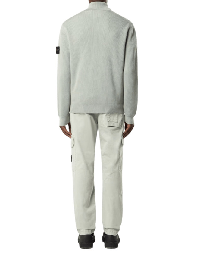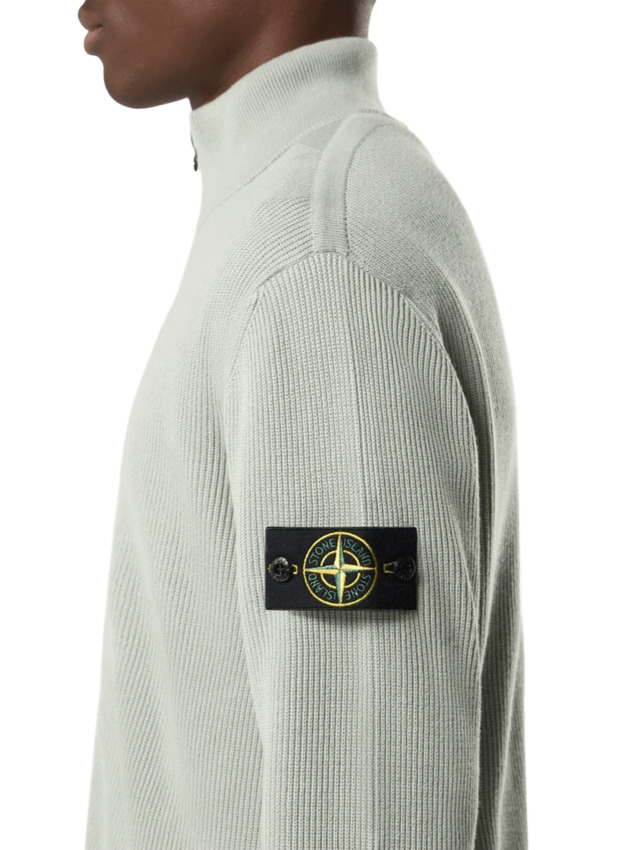 Maglione con zip in morbido cotone biologico a costine, con colletto rigido, inserti a punto rovescio, fasce a costine sottili sul retro delle spalle. Badge Stone Island sulla manica sinistra. Polsini e fascia inferiore a costine. Chiusura con zip a doppio cursore.