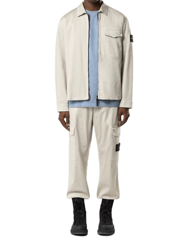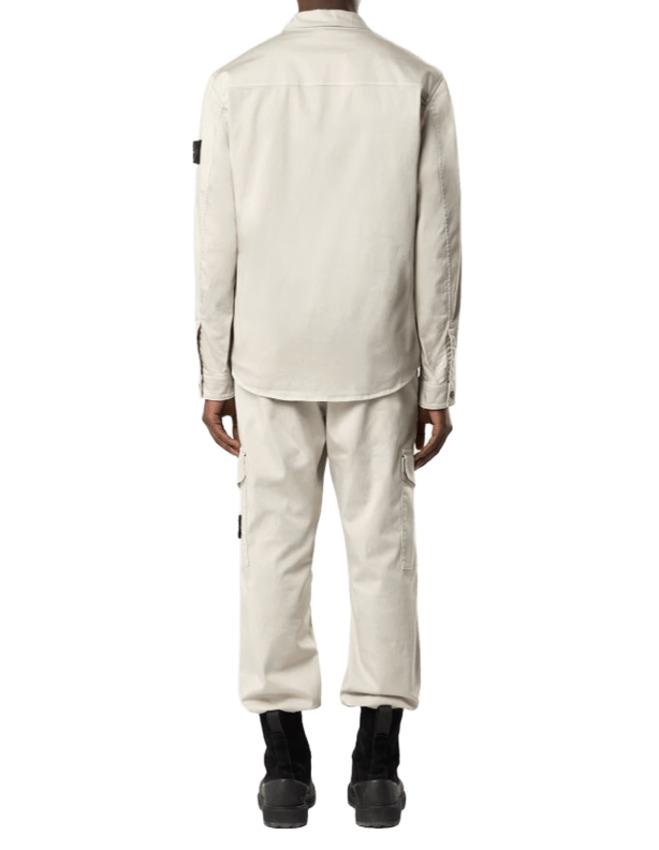 Overshirt in raso di cotone biologico stretch con tasca con bottone applicata sul petto, polsini con tbottone automatico e chiusura con zip a doppio cursore nascosta. Carré posteriore con rinforzo interno. Badge Stone Island sulla manica sinistra. Orlo posteriore più lungo e stondato. Modello tinto in capo.