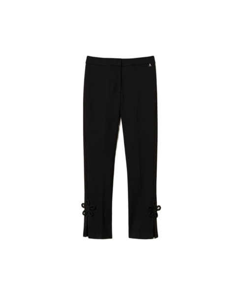 Pantaloni in punto Milano con applicazione di fiori in tono, vita bassa, chiusura con zip e gancio a uomo, spacchetti al fondo, linea a sigaretta.