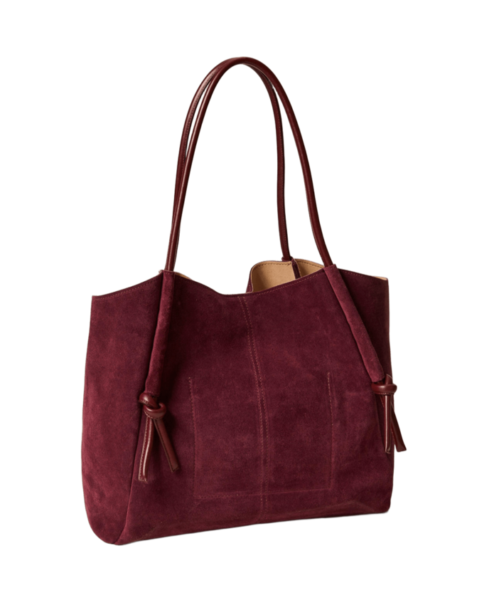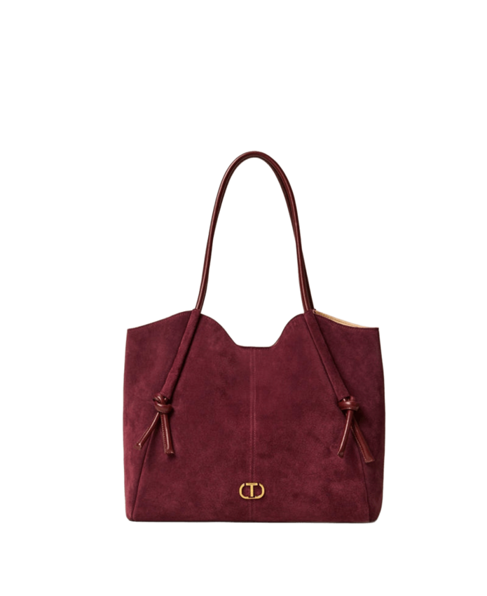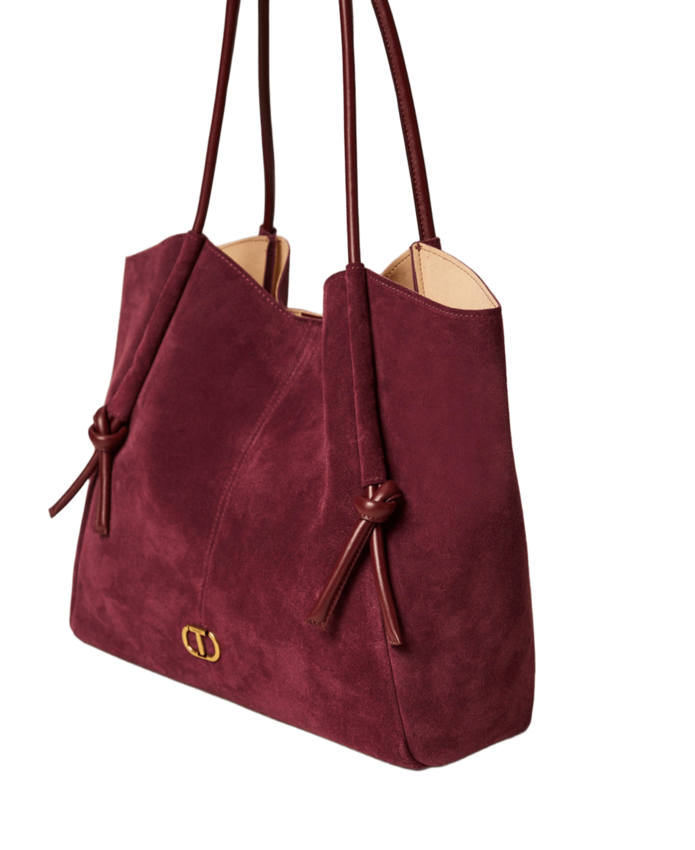 Borsa da donna in pelle scamosciata, shopper, manici in pelle, colore bordeaux.