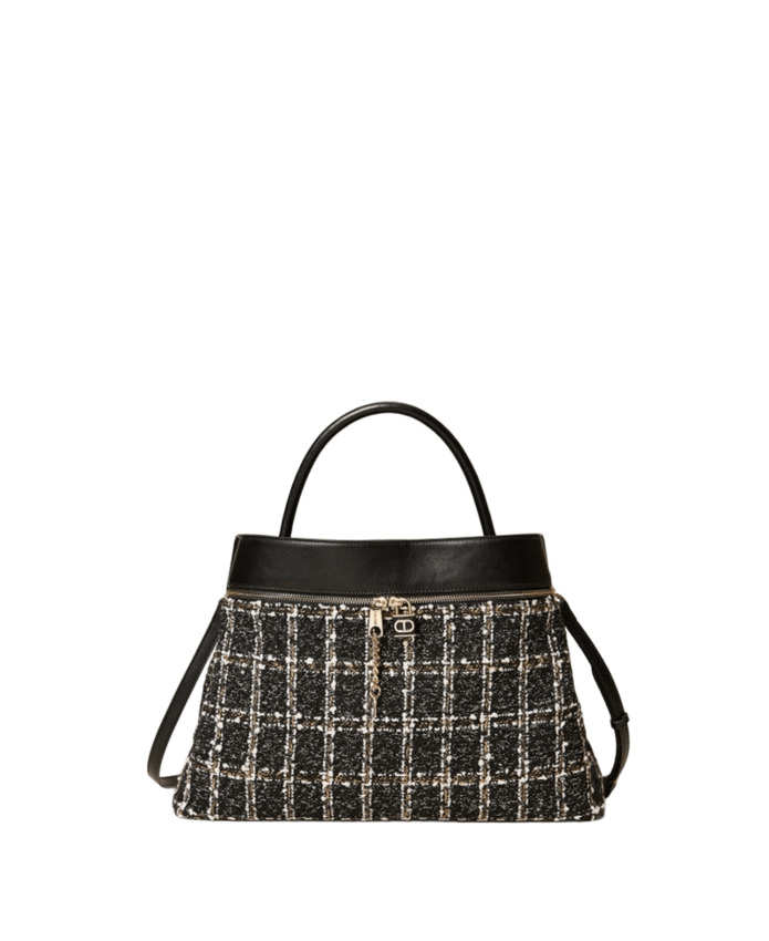 Borsa shopper in tweed jacquard con rifiniture effetto pelle di vitello liscio. Presenta doppio comparto interno e tasca con zip sul quadrante anteriore con lucchetto personalizzato Oval T. Manico corto tubolare a mano e tracolla rimovibile e regolabile per indossare il modello cross-body.