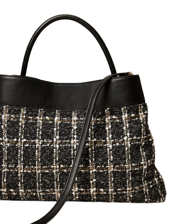 Borsa da donna shopper in tweed e ecopelle, a mano/tracolla, colore bianco/nero.