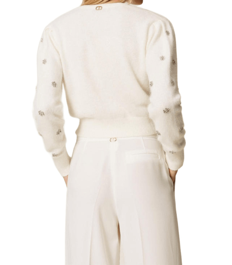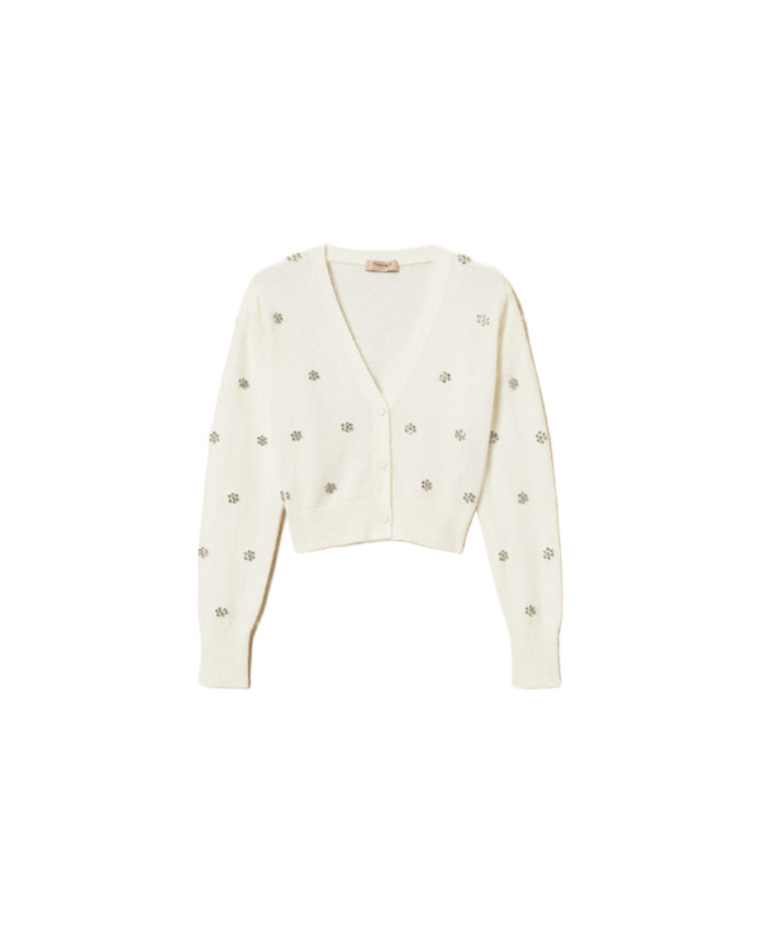 Cardigan da donna in misto lana, manica lunga, fiori strass applicati, color neve.