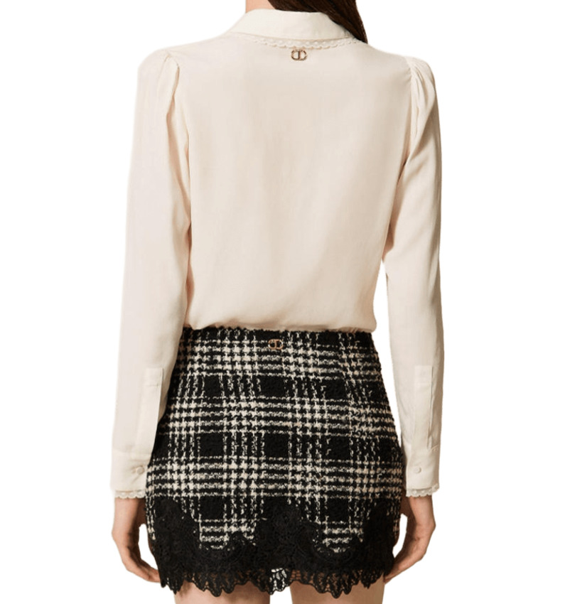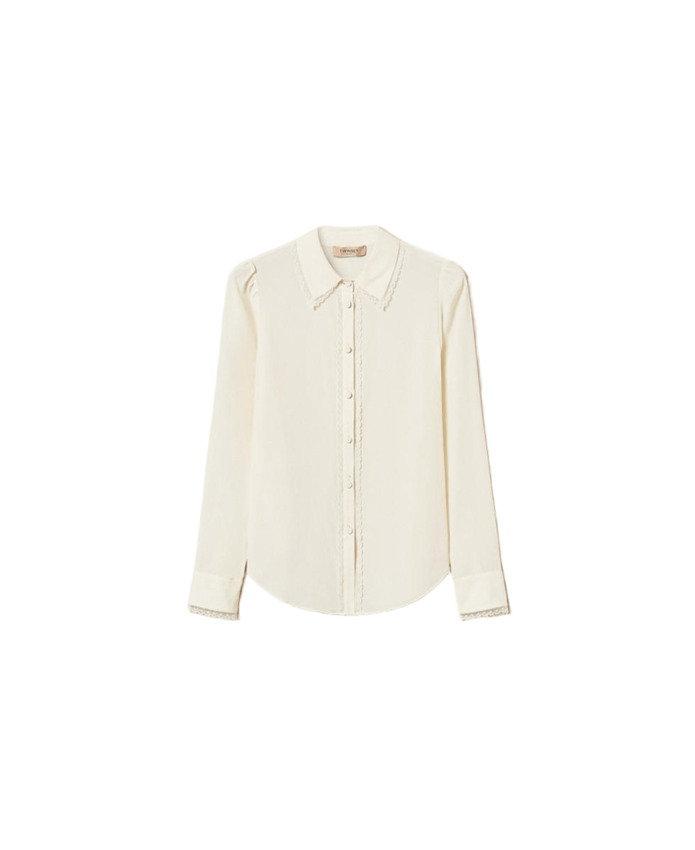 Camicia in crêpe de Chine fluido di viscosa e seta con passamaneria che rifinisce collo, apertura davanti e polsi. Presenta chiusura con bottoni ricoperti, maniche lunghe con polsino e bottone e placchetta logo Oval T sul retro.