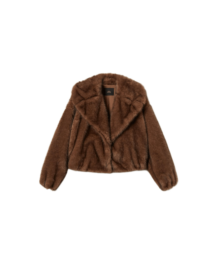 Giacca corta in pelliccia sintetica effetto visone con collo ampio con revers, chiusura con ganci davanti, fondo e polsi arricciati con elastico, fodera interna.