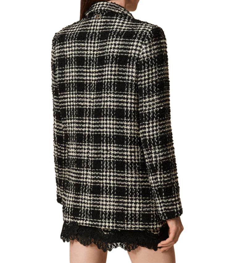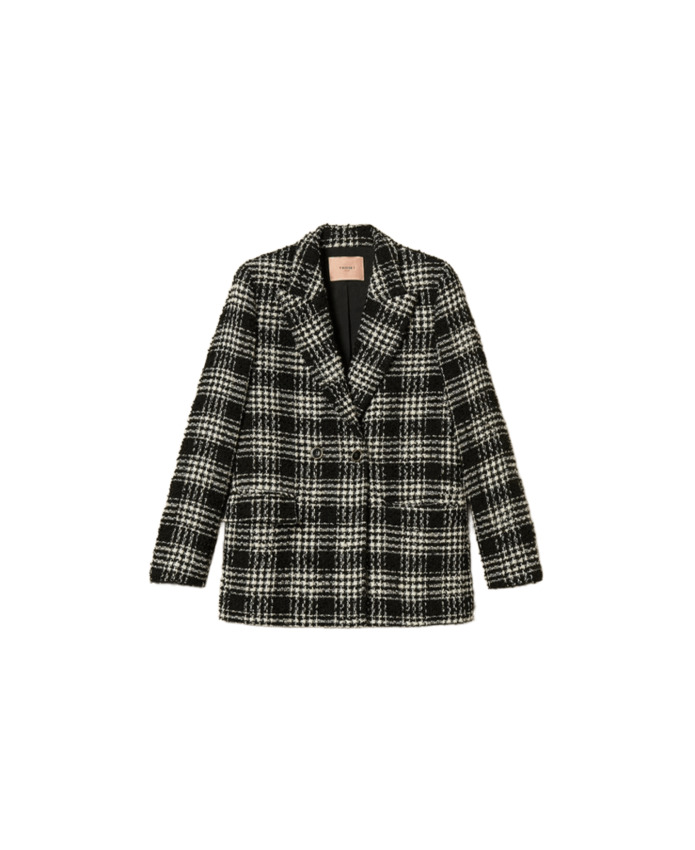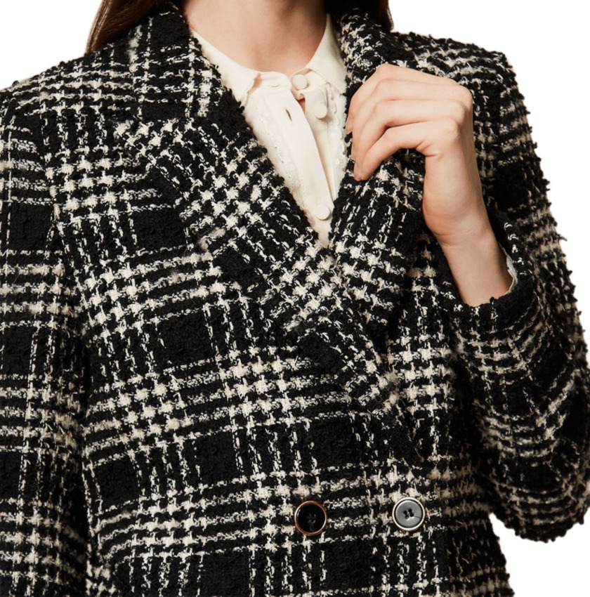 Giacca blazer in tessuto bouclé di misto cotone a fantasia check con collo revers, chiusura doppiopetto con bottoni con ghiera in metallo, tasche inserite con patte davanti, fodera e placchetta logo Oval T sul retro.