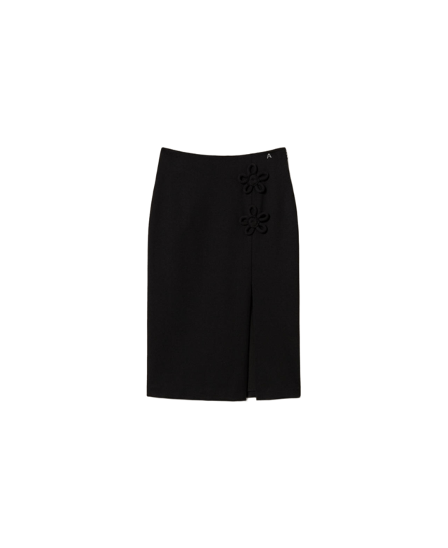 Gonna longuette tubino in punto Milano con applicazione di fiori in tono, chiusura con zip al fianco, piccolo spacco davanti, linea fitted.