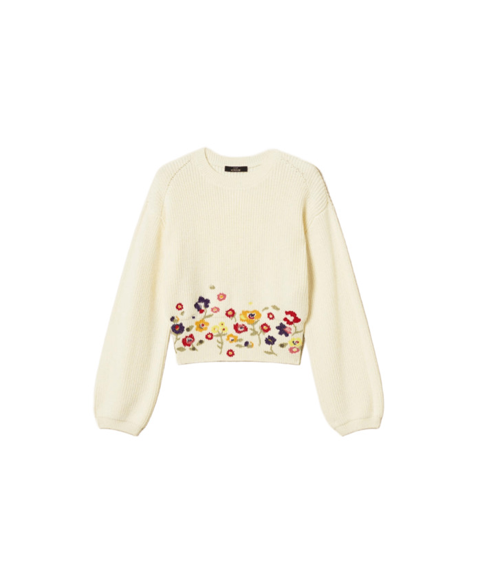 Maglia cropped in punto pannocchia, girocollo, con ricamo floreale multicolor sul fondo davanti. maniche lunghe, placchetta logo in metallo sul retro.