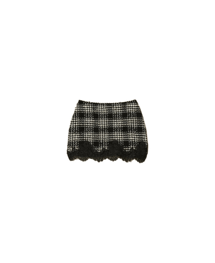 Minigonna in misto cotone bouclé, pizzo, fantasia check bianco/nero.