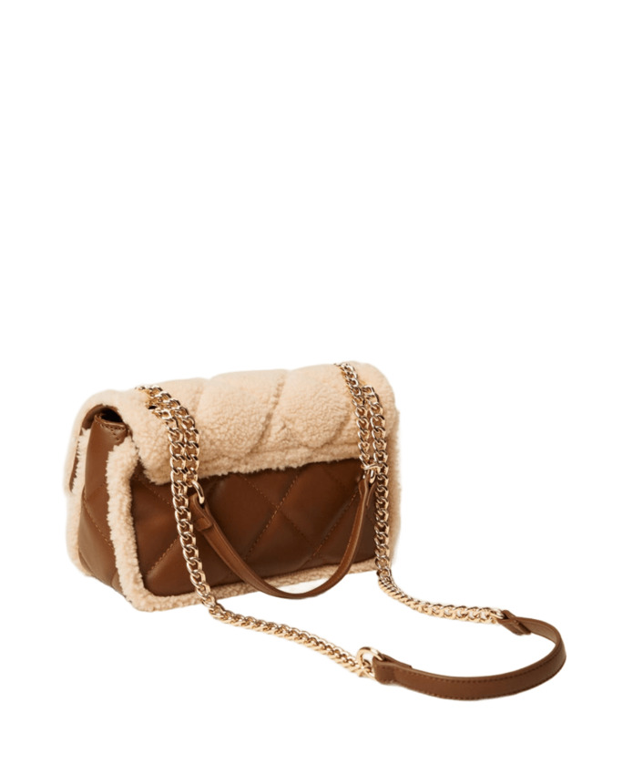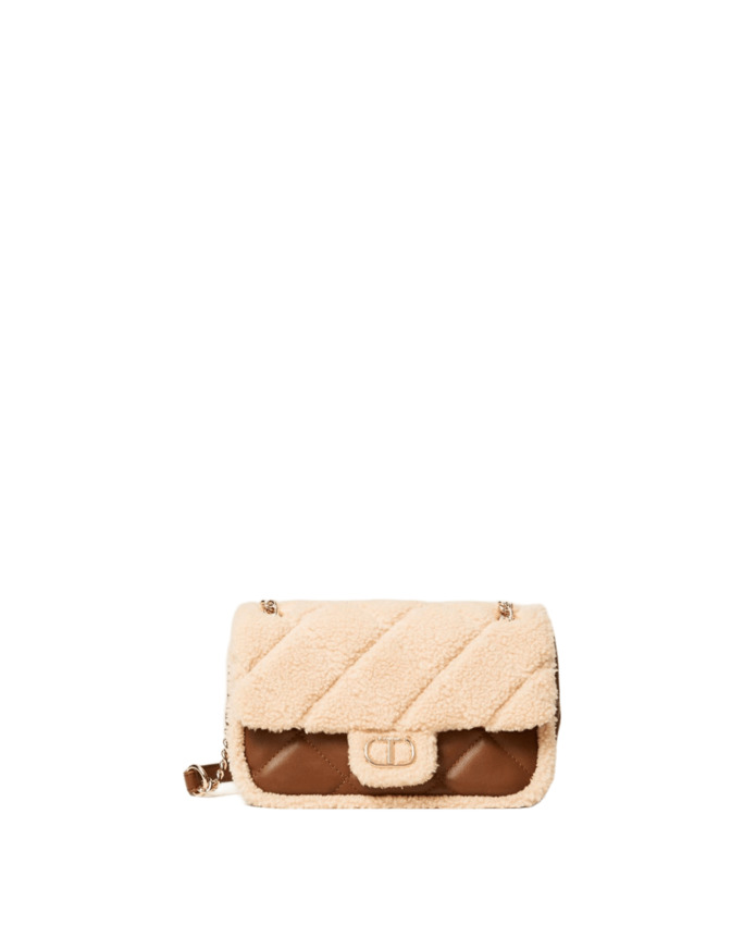 Borsa a tracolla effetto pelle di vitello nappato morbido con lavorazione quilted, dettagli e finiture in pelliccia sintetica effetto shearling. Presenta chiusura con patta e magnete, tracolla in catena scorrevole con spallaccio, logo Oval T in galvanica color oro. Foderata e con tasche interne.