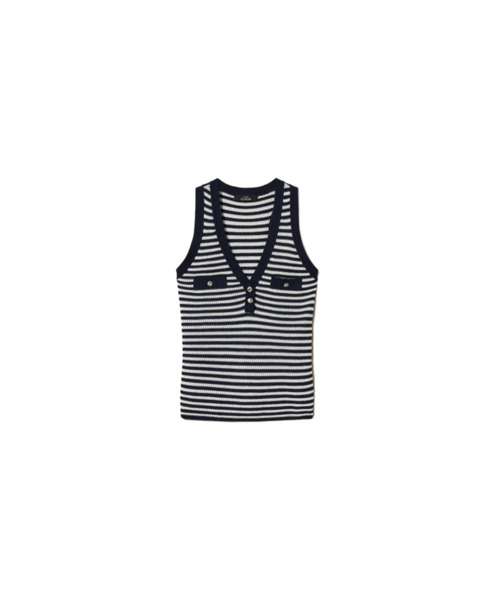 Top canotta in cotone a righe e lurex con bottoni gioiello, scollo a V profondo, finti taschini con bottoni décor, profili rifiniti a tinta unita,