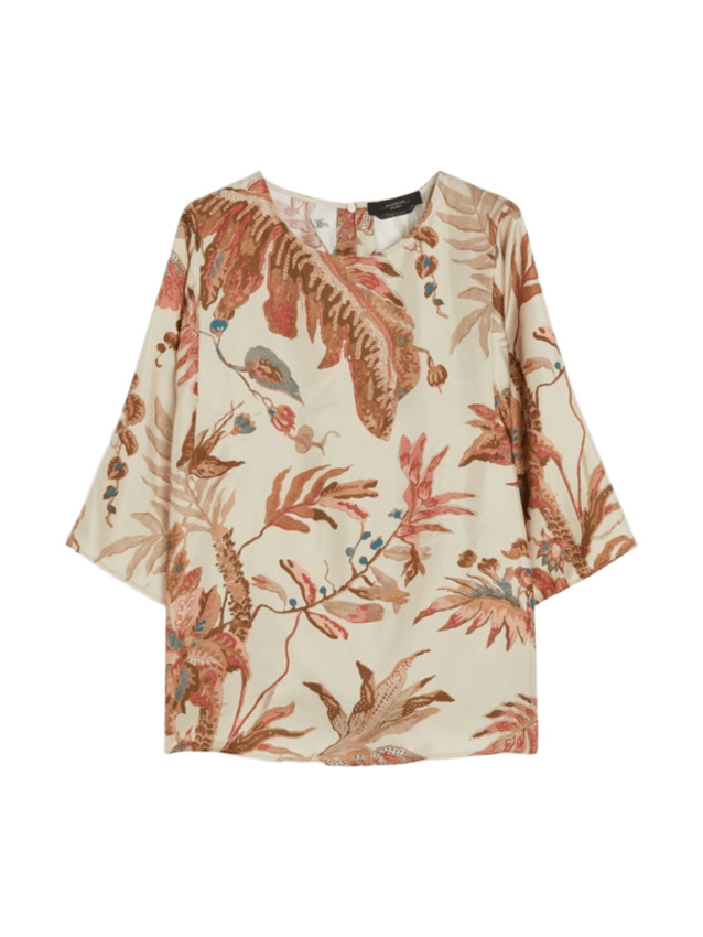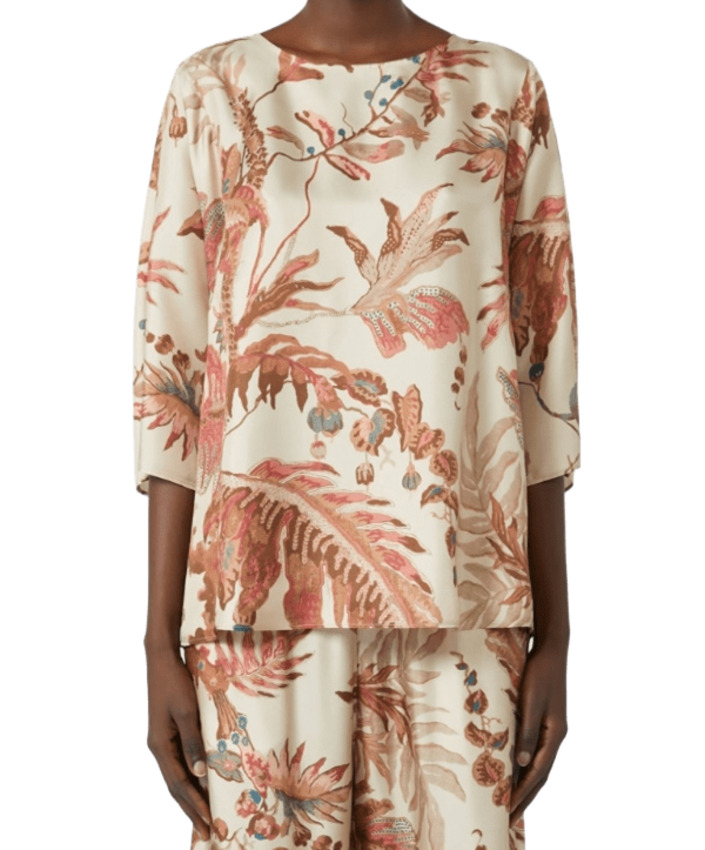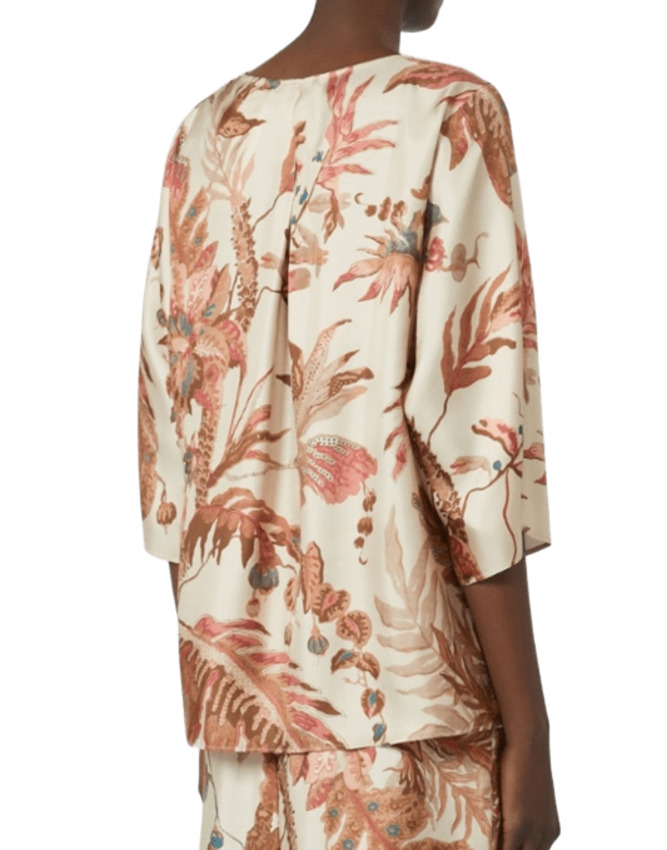 Blusa in pura seta, manica a 3/4, fantasia all-over sullo sfondo beige