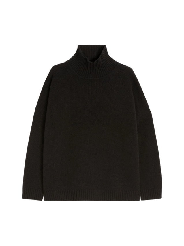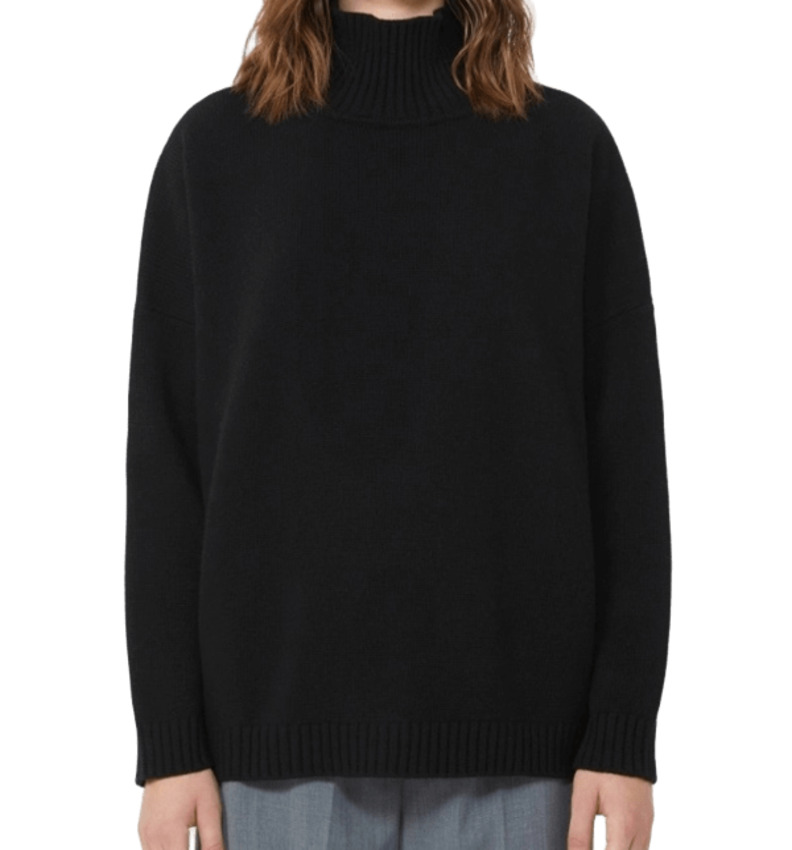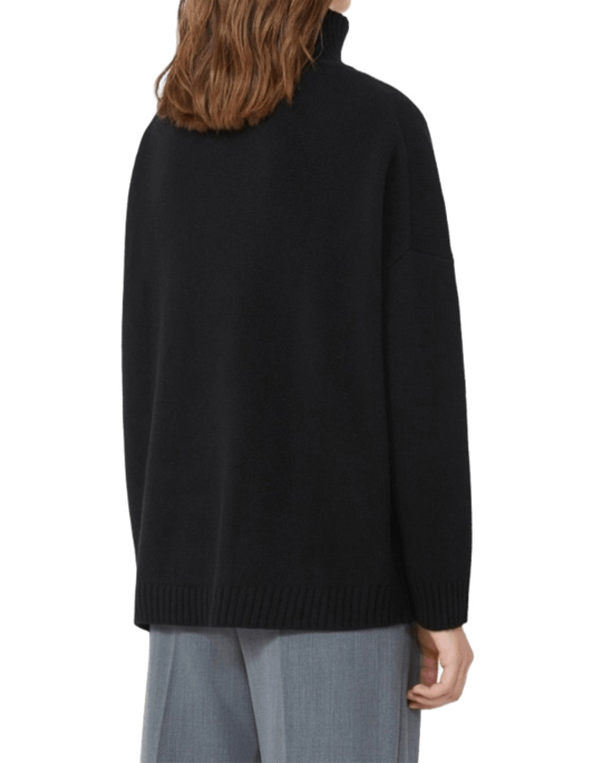 Maglione in pura lana lavorato a maglia liscia a collo alto dalla vestibilità leggermente oversize con maniche lunghe con spalle scese e bordi a coste.