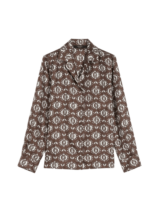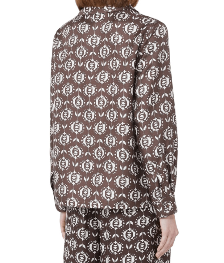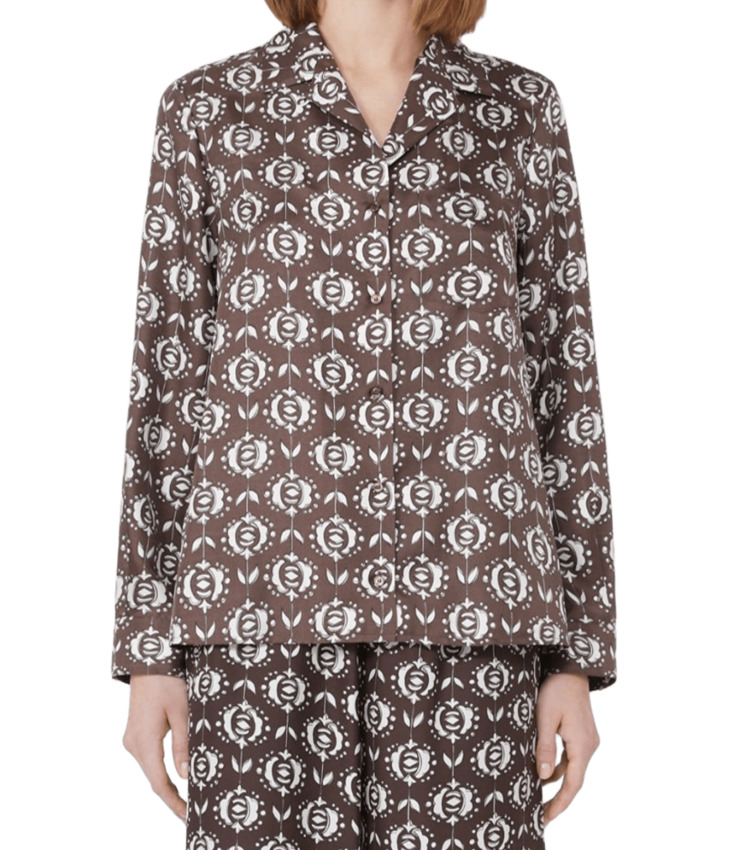 Camicia da donna in pura seta, stile pigiama, fantasia all-over sullo sfondo marrone