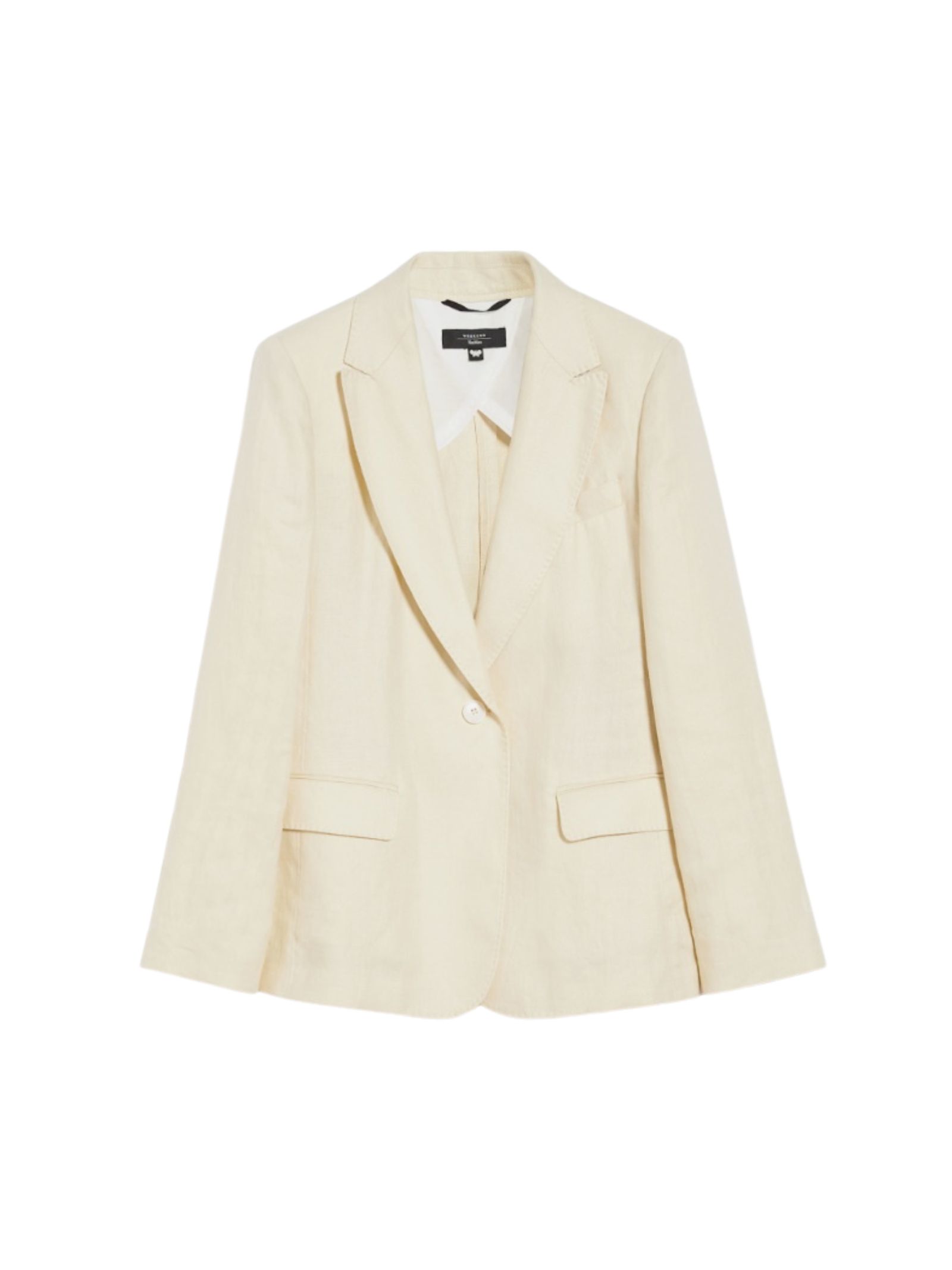 Blazer monopetto dalla silhouette dritta, realizzato in leggero tessuto di puro lino con collo a rever, taschino sul petto e tasche con patta sul davanti. Modello semifoderato, rifinito con impunture, bottoni sul fondo manica e spacco centrale sul retro. Chiusura frontale con bottone singolo.