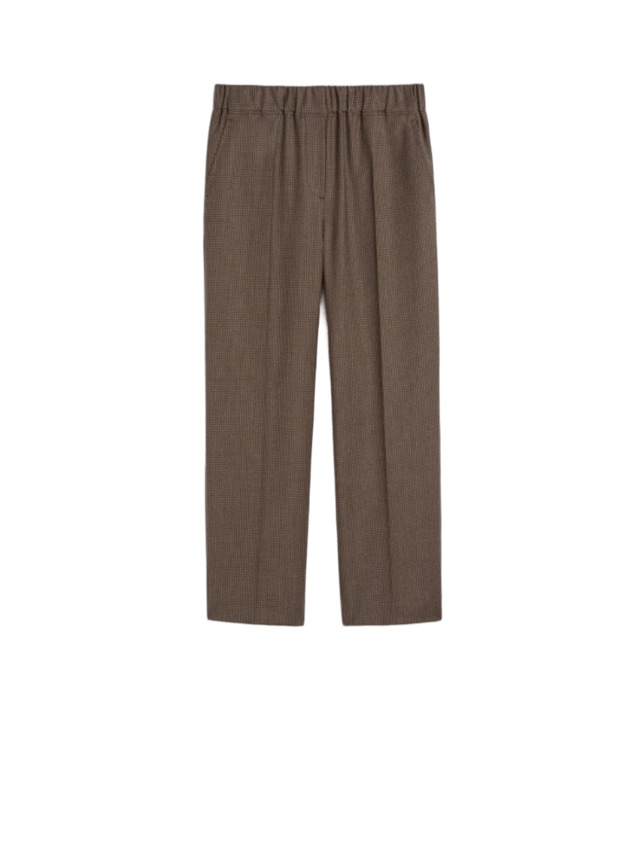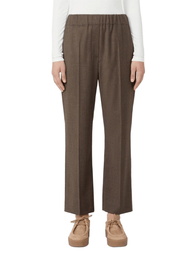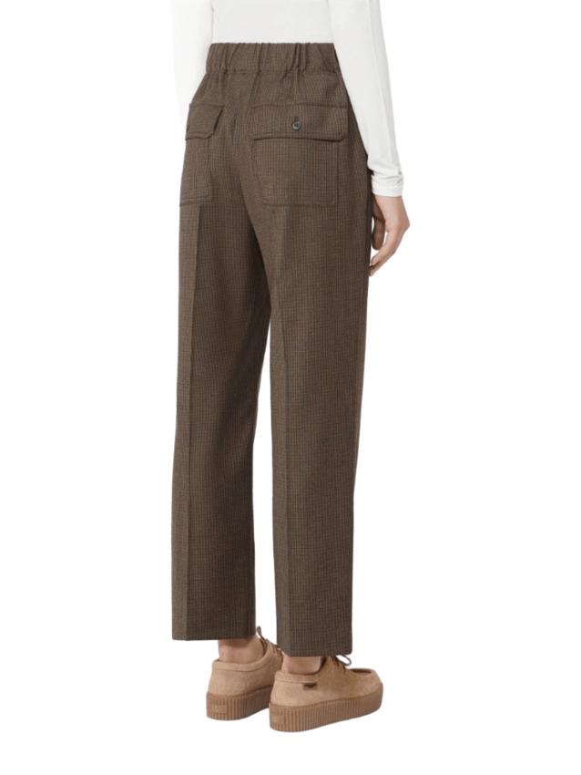 Pantalone in flanella di lana stretch, cropped alla caviglia con vita elasticizzata, tasche alla francese sui fianchi e tasche a toppa con patta e bottone sul retro.
