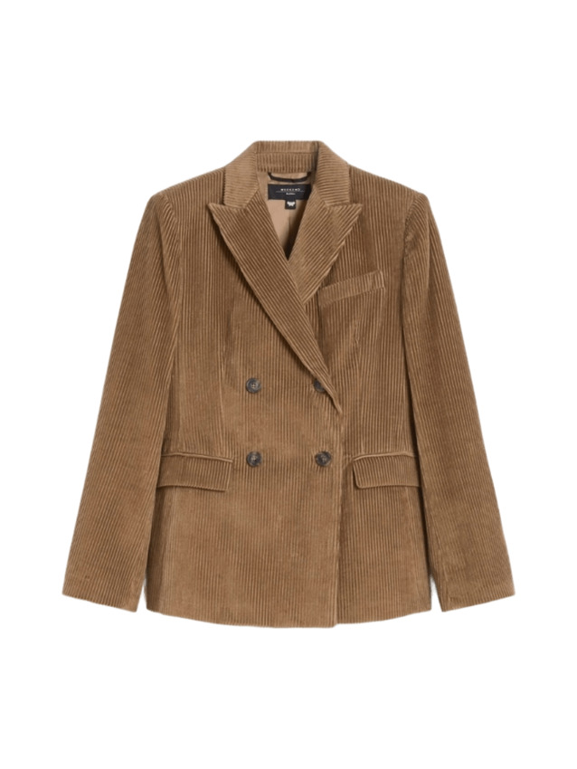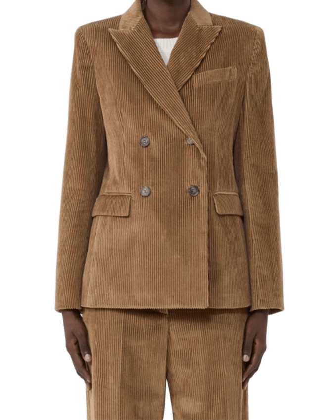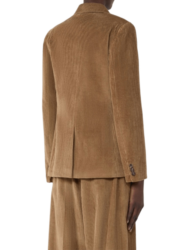 Blazer doppiopetto in velluto di puro cotone 350 righe dalla silhouette leggermente sfiancata e femminile con collo rever a lancia, maniche a giro con bottoni sul fondo, chiusura frontale con bottoni a vista, taschino sul petto e tasche con patta applicata sul davanti e spacco centrale sul retro.
