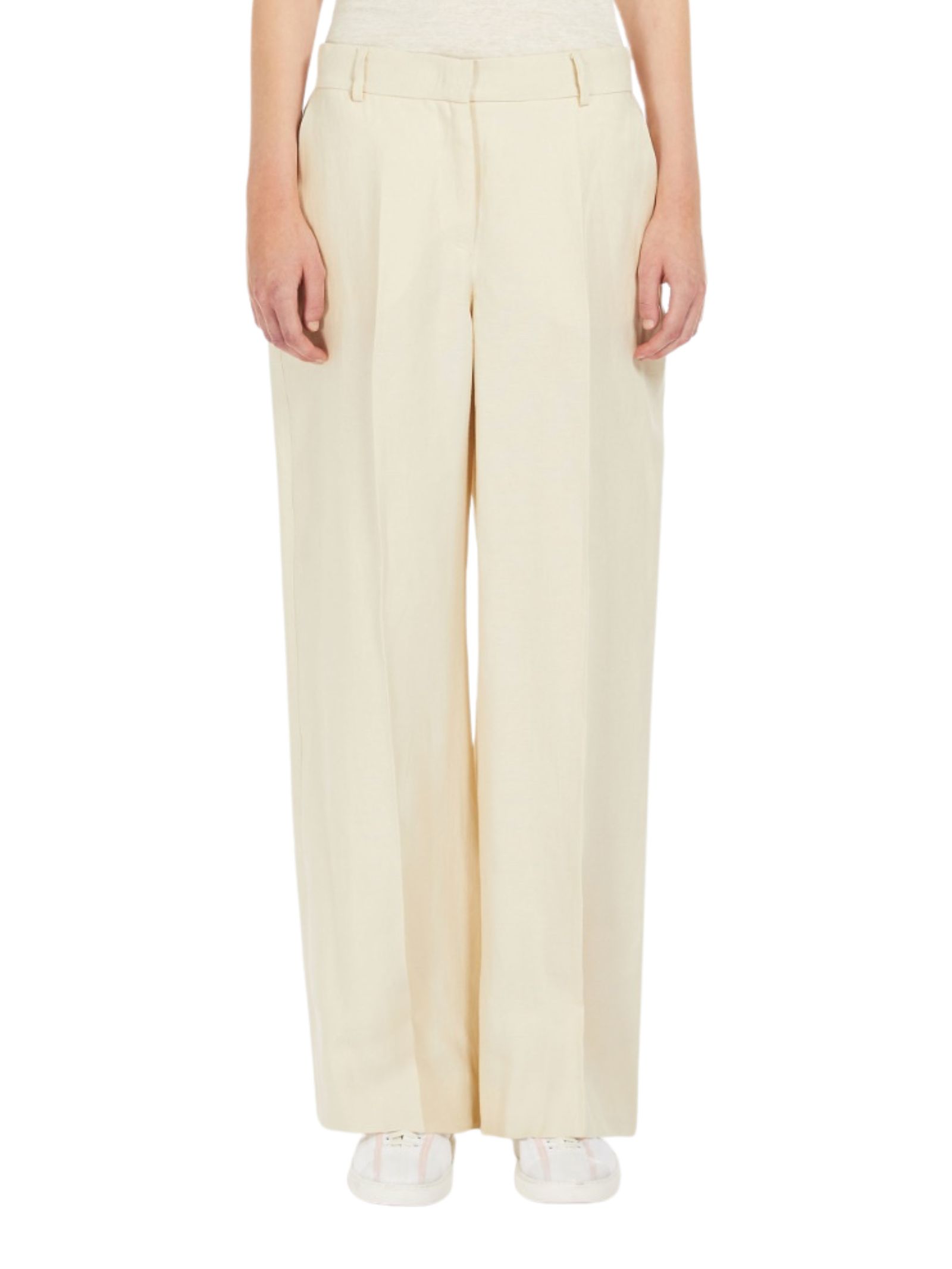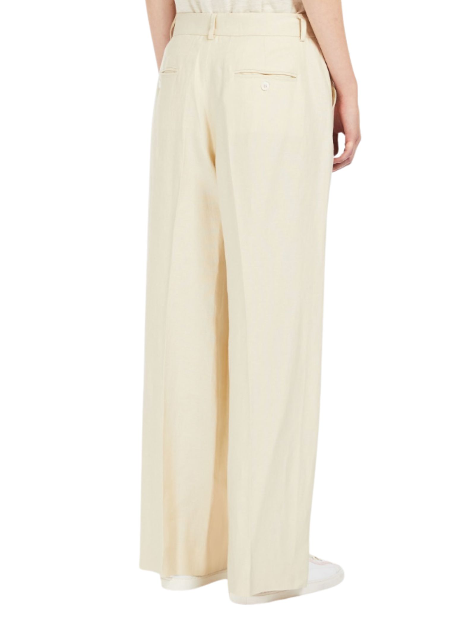 Pantalone in morbido canvas di puro lino lavato, caratterizzato da una silhouette ampia sulla gamba, piega stirata, tasche alla francese sui fianchi e tasche a filetto con bottone sul retro. Chiusura con listino alto in vita, zip con patta e gancetto.