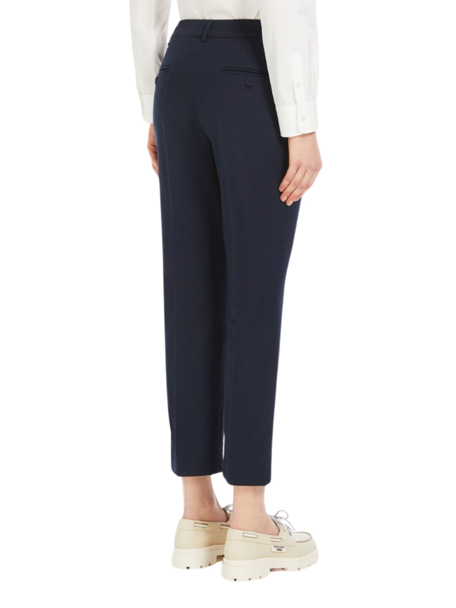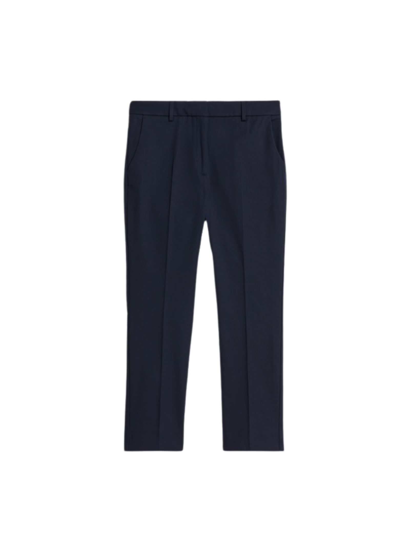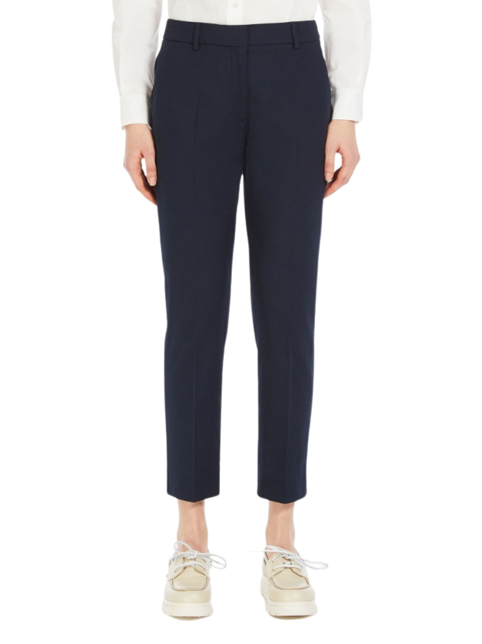 Pantalone in morbido tessuto di cotone stretch, caratterizzato da una silhouette a sigaretta con taglio cropped sopra la caviglia e piega stirata sulla gamba. Completato da tasche alla francese sui fianchi e tasche a doppio filetto con bottone sul retro. Chiusura con listino alto in vita, zip con patta e gancetto.