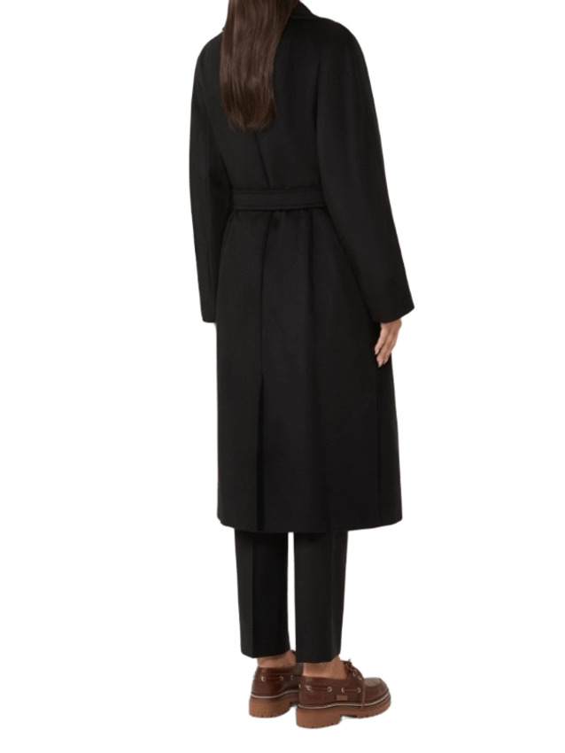 con cintura abbinata da annodare vita dalla linea dritta, con collo a rever ampio, maniche lunghe a kimono, chiusura con bottoni e tasche a filettone sui fianchi.