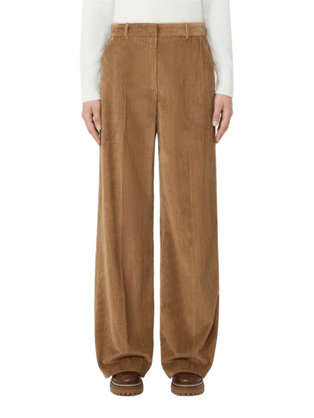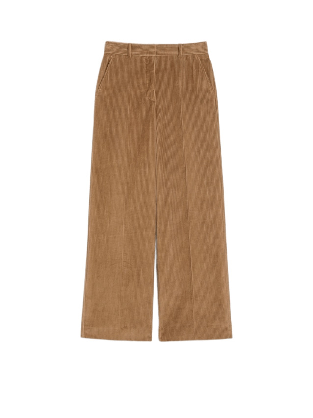 Pantalone in velluto di puro cotone 350 righe, lungo, dalla caratteristica silhouette wide leg con chiusura con listino alto in vita, zip con patta e gancetto, tasche alla francese sui fianchi e tasche a filetto sul retro.