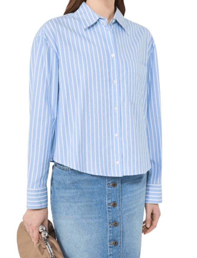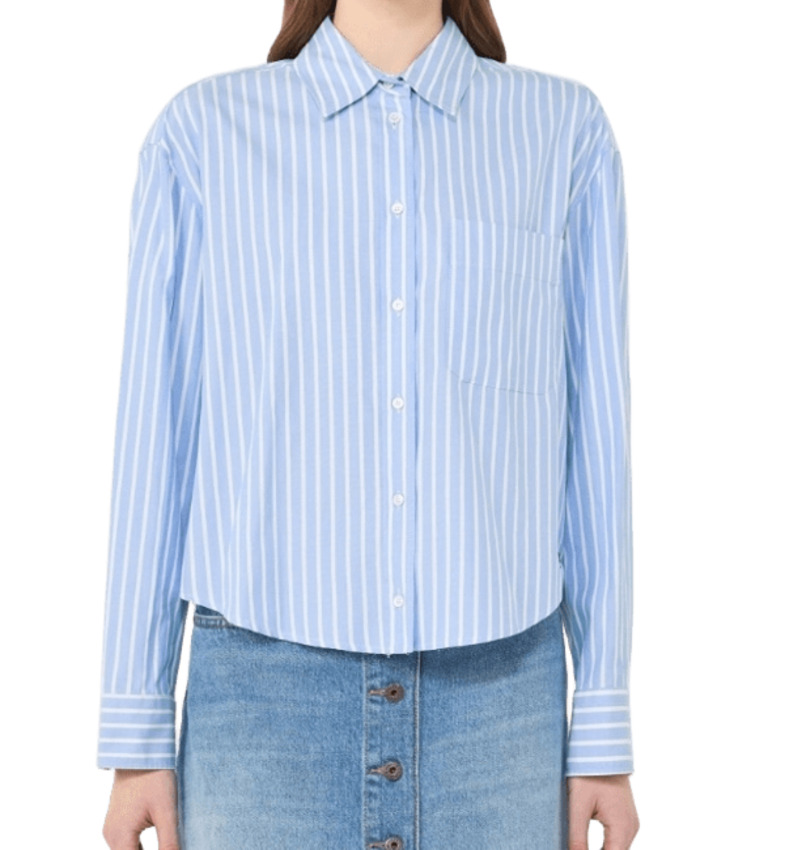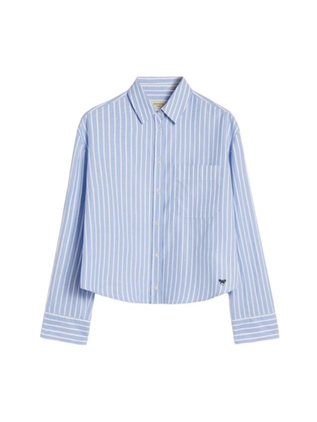 Camicia classica in Oxford di puro cotone a righe dalla linea boxy con maniche lunghe a spalla scesa e taschino sinistro applicato sul petto. Presenta, colletto e polsini a camicia, chiusura frontale con bottoni in madreperla, taglio sprone sul retro con piega centrale sulla schiena e fondo stondato.