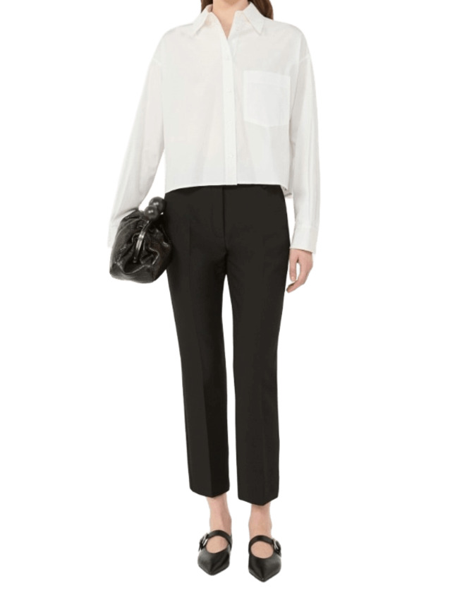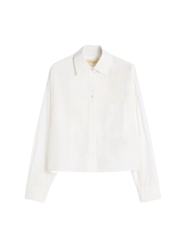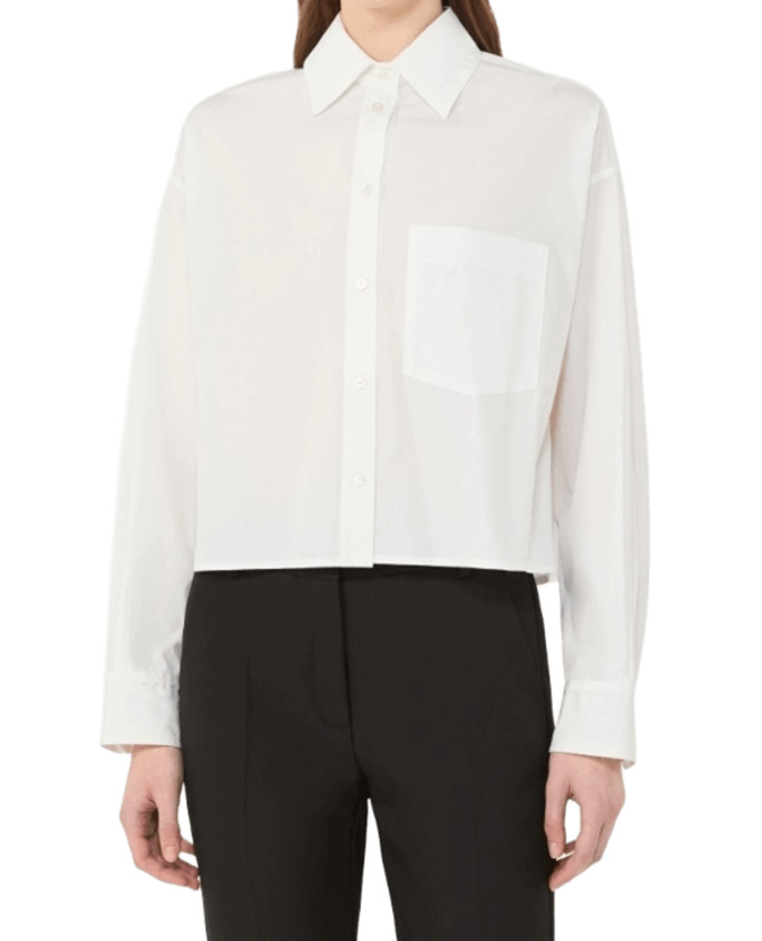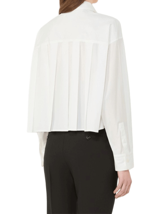 Camicia crop in popeline di puro cotone d'ispirazione classica con motivo a pieghe sul retro e taschino sinistro applicato sul petto.Presenta una linea dritta con spacchi laterali, colletto e polsini a camicia, maniche lunghe con spalla scesa e chiusura frontale con bottoni in madreperla.