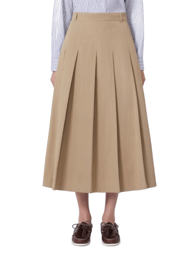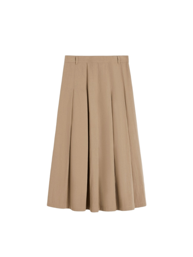 A-line costruita con pannelli a pieghe davanti e sul retro. Presenta una linea svasata, chiusura con zip sul fianco, tasche a filetto con bottone sul retro e passanti per cintura in vita.