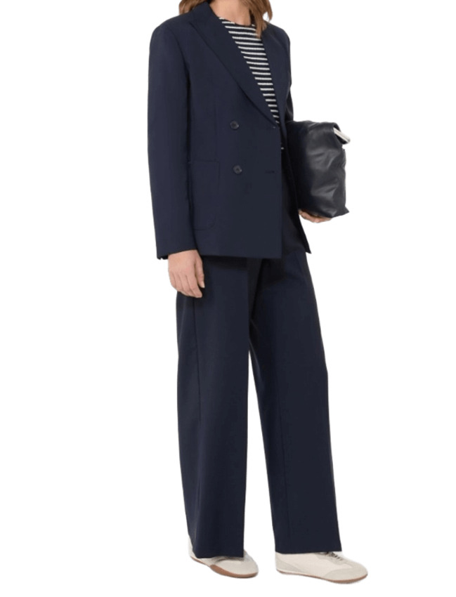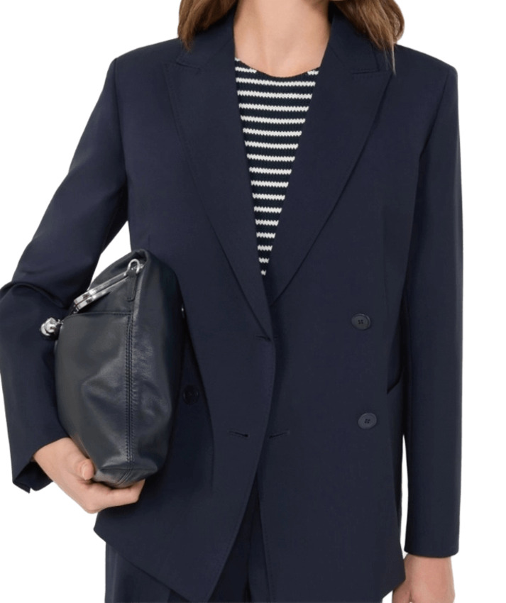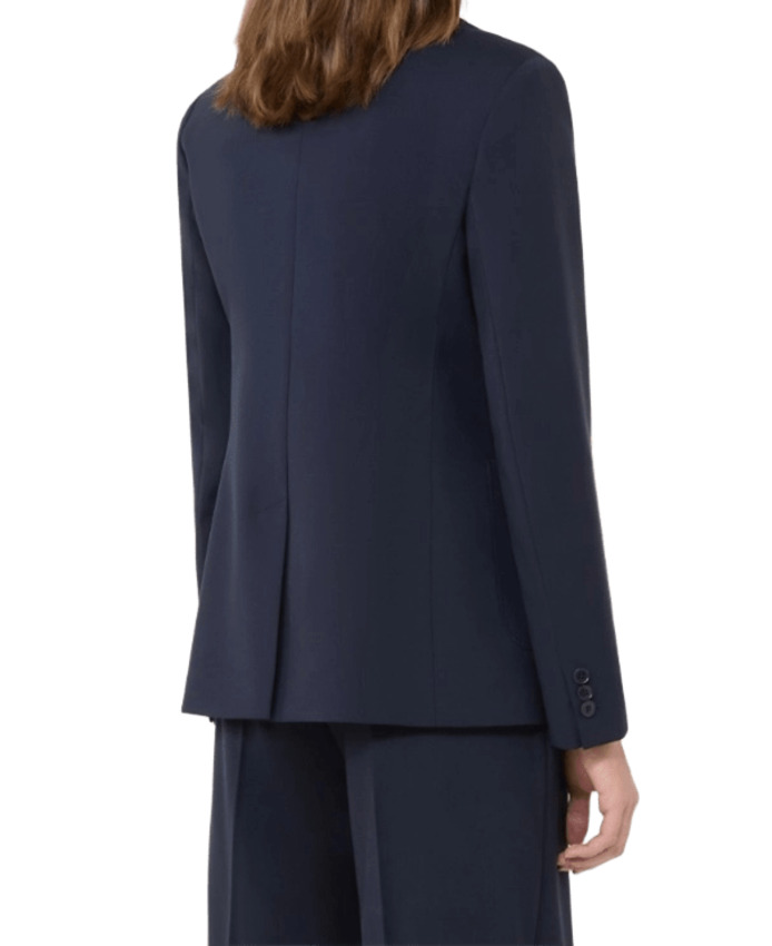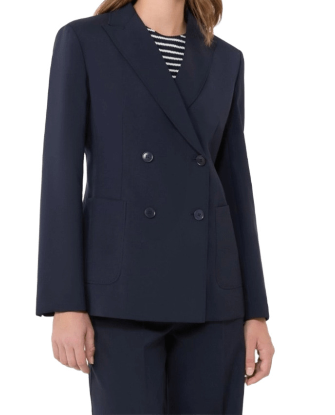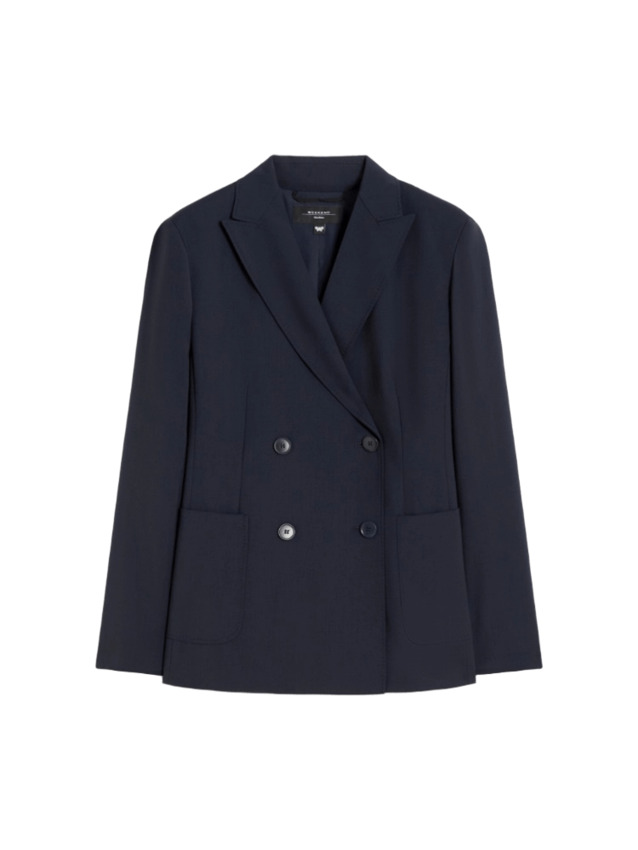 Blazer in tela di pura lana natural stretch, doppiopetto con costruzione sartoriale e linea leggermente sfiancata. Presenta collo rever a lancia, maniche a giro con bottoni sui polsi, chiusura con bottoni e tasche applicate sul davanti.