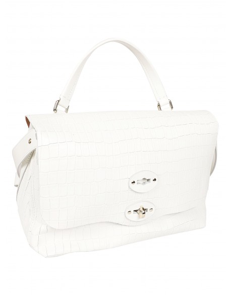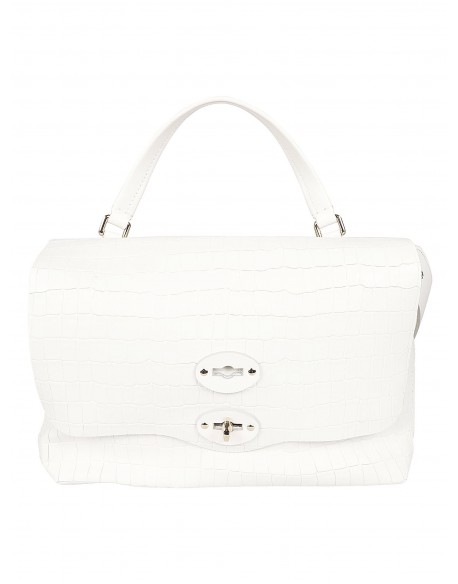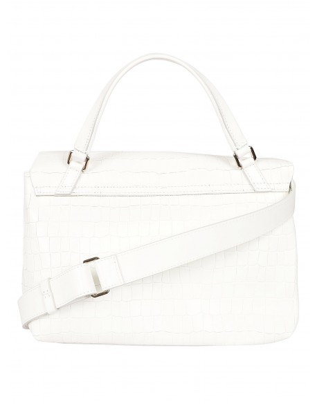 Borsa in pelle stampa cocco a rilievo colore white lino.Patta anteriore con chiusura twist lock.Parti in metallo color oro.Un manico, tracolla regolabile